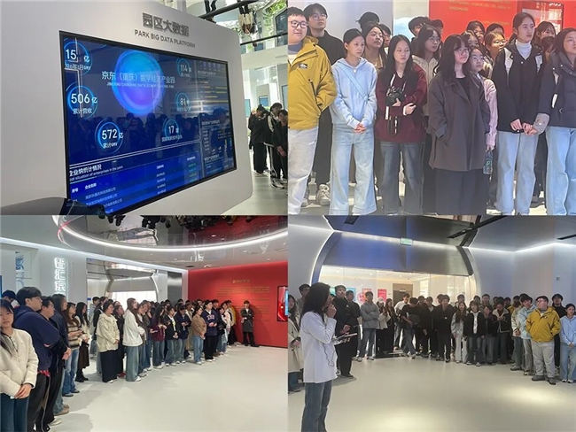下午2點,師生們準時抵達園區。在園區運營負責人的熱情引導下,大家首先參觀了京東園區數智展廳。通過專業講解員的細致講解,師生們深入了解了園區在人工智能、大數據領域的產業布局與落地成果,直觀感受了京東園區作為“產教融合高地”的科技氛圍與發展潛力。